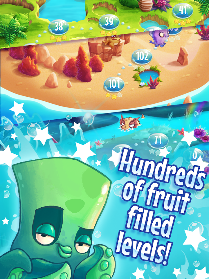 Match four, five, or more fruit to call in Coral, Octo, and the rest of the Nibblers. These fish have some tricks up their sleeves. Use their special abilities to munch more fruit, topple the lizards, and take out obstacles.