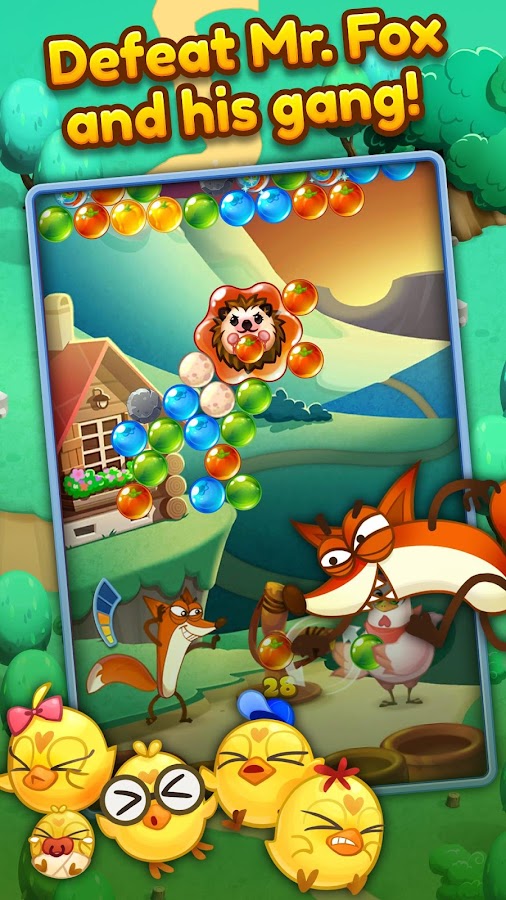 Shoot through bubbles in hundreds of levels to save the chicks, squish spiders, and beat the fox! But watch out, as Mr. Fox has set up numerous traps like the slime bubble to keep you from reaching your goal!