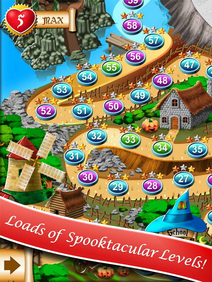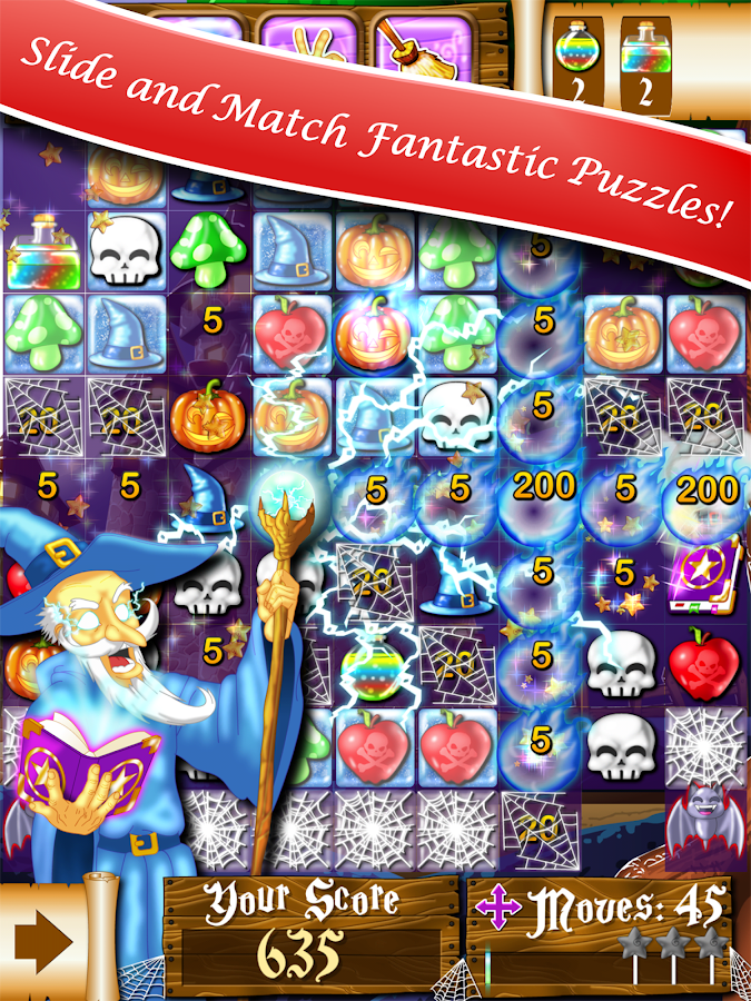 magic potions - Amazing magical boosters to power up for harder levels - Combine enchanted items in spectacular combos to clear levels in big matches - Free chance to win Boosters when you play on a daily basis - Unlock fantastic items by completing levels and also unlock hidden special levels - Completely FREE strategy and matching game with FREE updates, including new levels and challenges - Seamless Facebook integration to share your progress with friends and invite them to play! - One of the best FREE brain teaser games you can find! - Super easy and fun to play, but hard to master! To help you get through all the Spooktacular levels, this amazing match 3 game of witchcraft offers a numbers of Boosters: - Magic Book: Combine it with an item to destroy all items of the same type - Bat: Touch it to remove 3 spider webs. - Magic Combo: Start the level with the Magic Fire and a Crystal Ball combo! - Wizard Spell: Clear all the items of the game! - Free Move: Move an item freely, even without a match! - Magic Broom: Sweep an item from the game! - Magic Wand: Select 8 connecting items to destroy them! - Extra Seconds: 15 Extra Seconds to help you finish a level! - Extra Moves: 5 Extra Moves to help you finish a level! Start