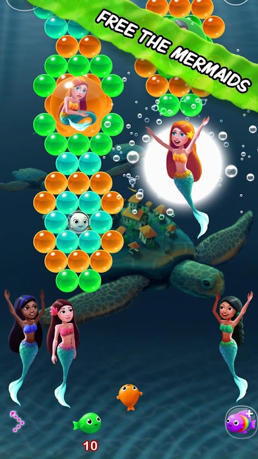 Bubble Fins is a simple, yet addictive bubble shooter / bubble popper game for all ages. Aim and bust through bubbles to rescue mermaids. Pop your way to the mermaids by matching your fish's color with two or more bubbles of the same color. Choose between multiple power-ups, like rainbow or puffer fish, with different special attacks. Burst higher balls to drop lower balls from the mass. No witches, no mania – just interesting puzzles, amazing graphics, beautiful music, and the cutest fishes around. Blitz through Atlantis, past Sunken Ship Island, and get hooked in this undersea adventure.