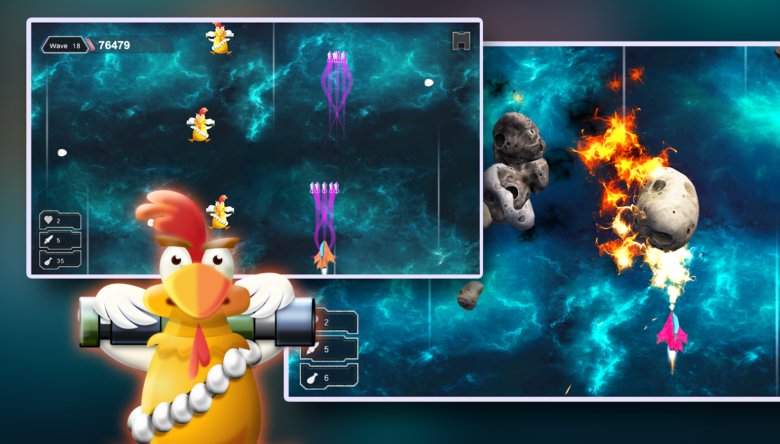 The chicken from the galaxy have a devious plan to take over the earth. They want to revenge for their species from earth. The human has used the chicken for centuries. They try to invade the earth by sending war ship. As a hero, you mission is to stop the space invader.