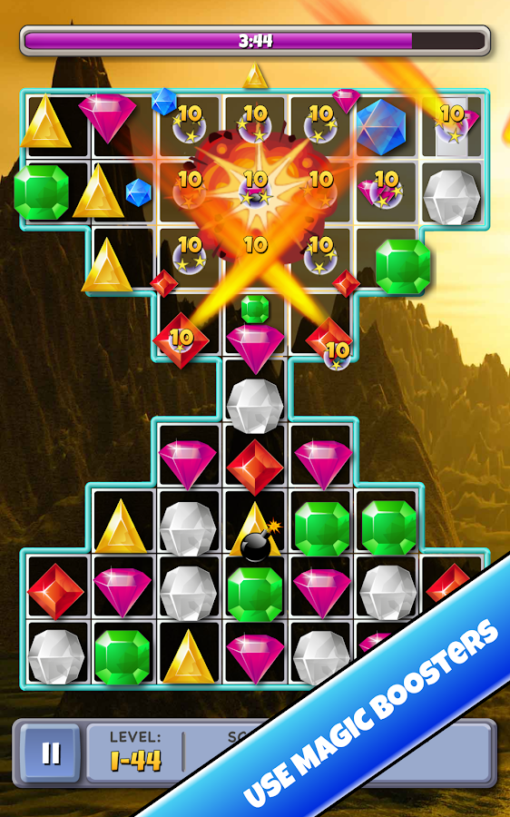 Match 4 or 5 jewels to get bomb or magic jewel. Use bombs, magic jewels and flashes to hit more jewels. Match clock jewels to extend your time.